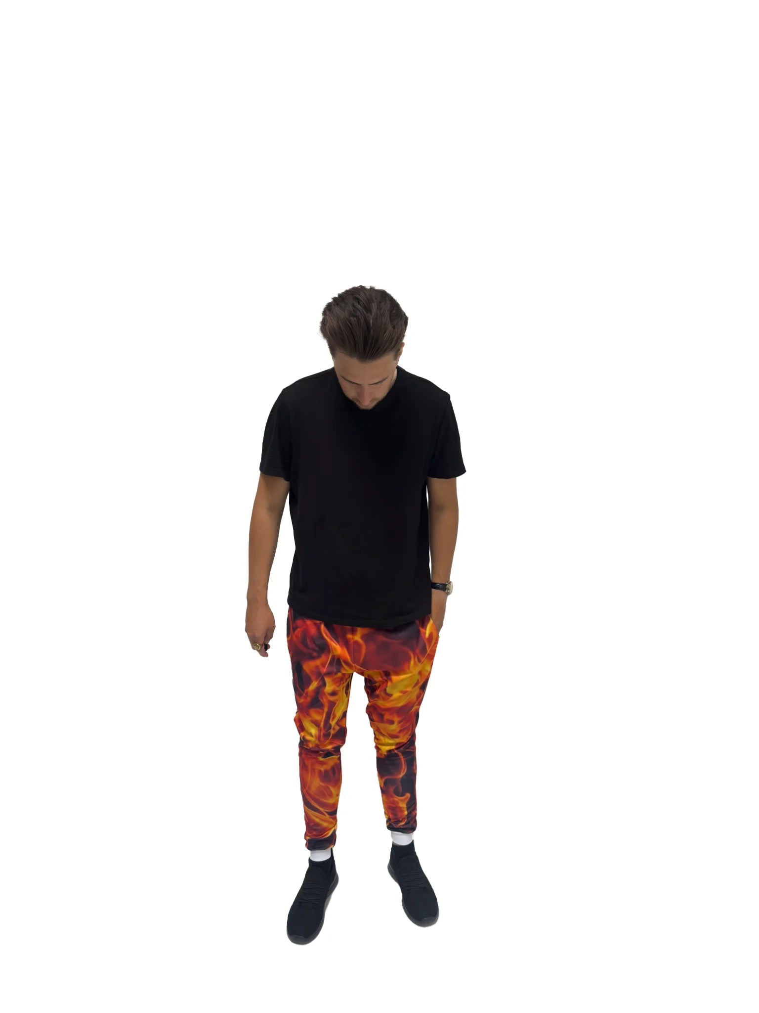 Made to move. The Firestate trousers are built for motion, impact, and bold energy — finished in an all-over flame print with a relaxed athletic fit.